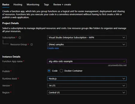 In order to setup Azure functions with Okta OpenID Connect (OIDC) authentication, you start by creating a new Azure function in the Azure dashboard. Provide the subscription and resource group, along with the App name. In this case, we will use a Node.js function for simplicity.