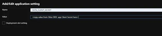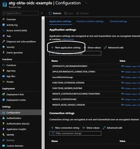 Navigate back to the Azure Portal, then select “Function App” and the name of your app. You will see a Overview page. Now navigate to the “Configuration” option under settings and select ”+ New application setting”. This will be where we put in our Okta Client secret from our OIDC application. Name it (in this case I have used “OKTA_CLIENT_SECRET”) and then hit Ok. Do not forget to hit the “Save” button at the top of the page to save your changes!