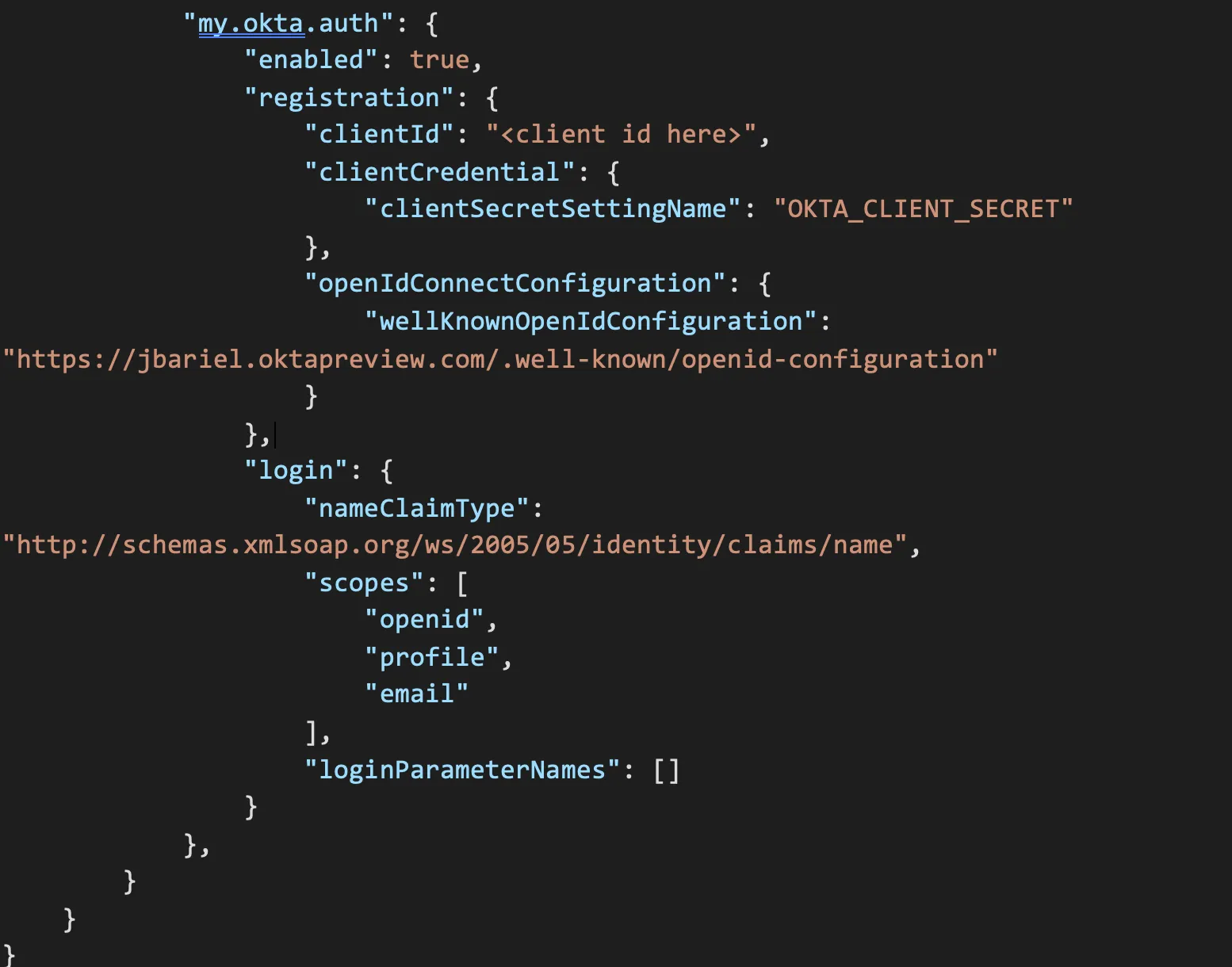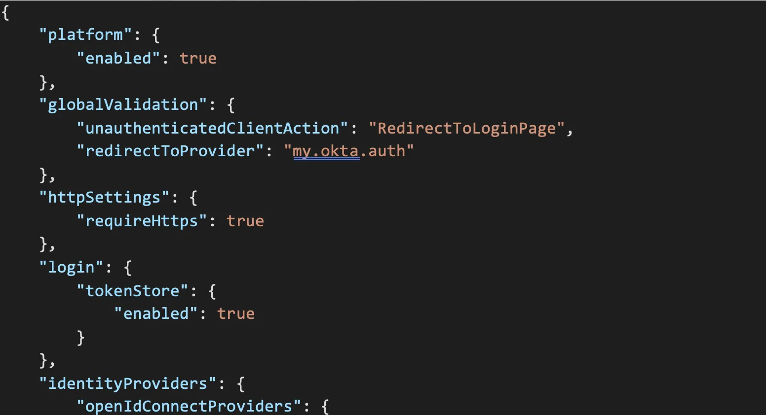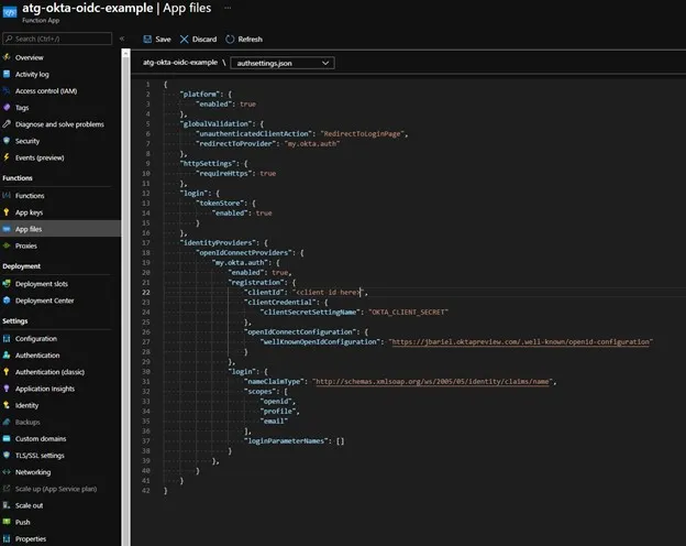 This presents an empty file that we can populate with our identity provider information. The full file reference can be found within Microsoft Documentation. Populate the authsettings.json with the correct JSON information, my example is posted here: