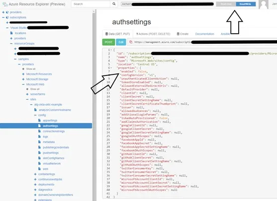 This JSON file configures auth for your Function App and is how we will tell Azure to use your authsettings.json file. Select the “Read/Write” button at the top of the page, and then the “Edit” button at the top of the JSON file. Modify the “enabled” value inside of “properties” from “false” to “true”.