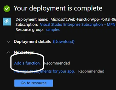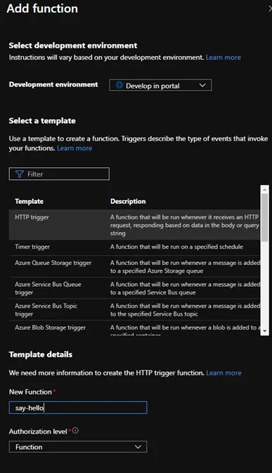 For this example, we will select “Review and Create” at the bottom of the page, then select “Create”. Once the Function App is deployed, it will show an option to “Add a function”. Select this and then select the “Add” button at the top of the page. For this demo we will use the HTTP trigger template, and call the function “say-hello”.