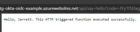 Function URL with my name: https://atg-okta-oidc-example.azurewebsites.net/api/say-hello?code=