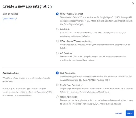 Navigate to your Okta tenant, then login to the admin dashboard and navigate to “Applications” => “Applications”. From this page, select “Create App Integration”. You will see a wizard appear – select the OIDC Web Application options and hit Next. Name the application, and the set the Sign-in and Sign-out redirect URIs. The Sign-out will be the same as your Function App URL, the Sign-in will be the Function App URL appended with “.auth/login/