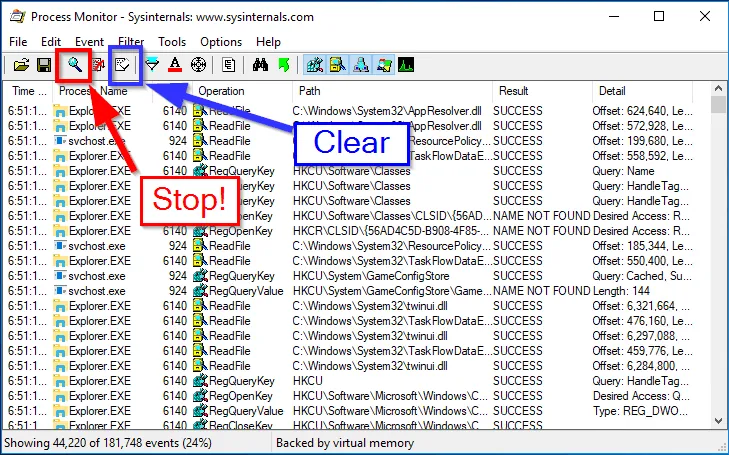 ProcMon to the rescue! Starting up ProcMon it immediately bogs the machine down, capturing everything happening, with little regard for man nor beast. As soon as you can, stop the capture and clear the existing results: