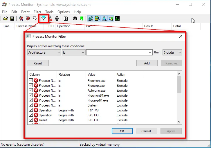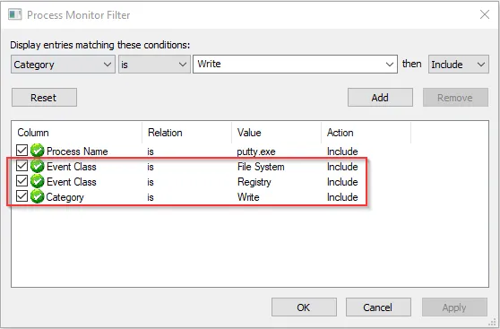 With our final set of filters, Click Apply and OK, restart the ProcMon capture and launch putty.