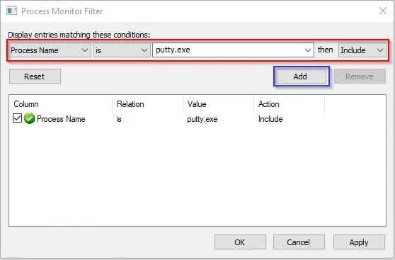 From looking at the task manager, we can see that PuTTY is a single process called “putty.exe”, so we will start with a filter to only include operations from that process.