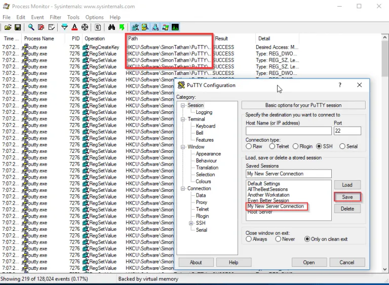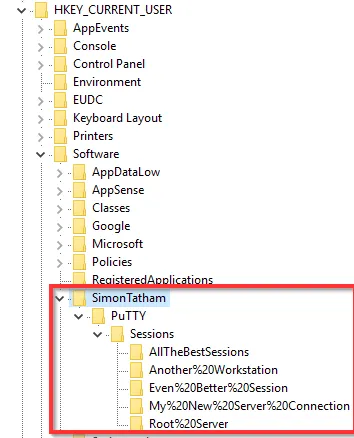 Ah-ha! By adding a new connection and clicking Save, PuTTY makes a write of the session’s data to the Registry. Specifically, under HKEY_Current_UserSoftwareSimonTatham …. Whoever that is.