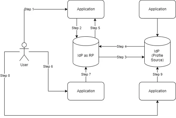The application delegates access to the IdP as a RP (Step 2), which then delegates the identity to the profile source IdP (Step 3). Once the Profile Source IdP validates the user identity, it will pass access (e.g., a token) back to the IdP as an RP (Step 4).