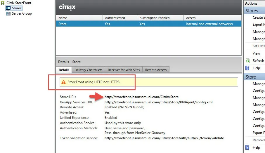 You can see here StoreFront is warning me about this because again, in Production environments you should always use SSL whenever possible: