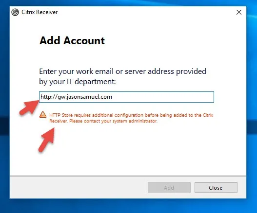 If you add “HTTP” to the URL, it will give you a warning like this: HTTP Store requires additional configuration before being added to the Citrix Receiver. Please contact your system administrator.