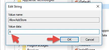and double click the “AllowAddStore” key to edit it. Add the value “A” like this: