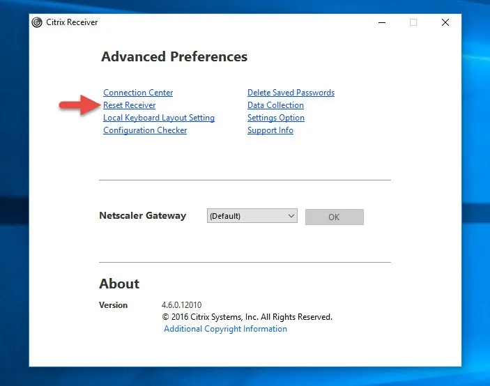 At this point you can open Receiver and hit Logon but it may act flaky as you login and enumerate your apps and desktops. The better thing to do is to right click Receiver in your system tray and go to Advanced Preferences. Click the Reset Receiver option: