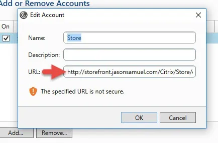 In the Edit Account dialog, you can see it took the backend StoreFront Base URL. Receiver is complaining that “The specified URL is not secure” even though you are going through SSL ICA Proxy via the NetScaler Gateway: