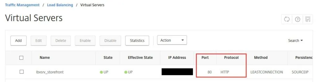 Here is the loadbalanced vserver with my 2 StoreFront servers in a Service Group behind it. You can see here I am using HTTP (port 80):