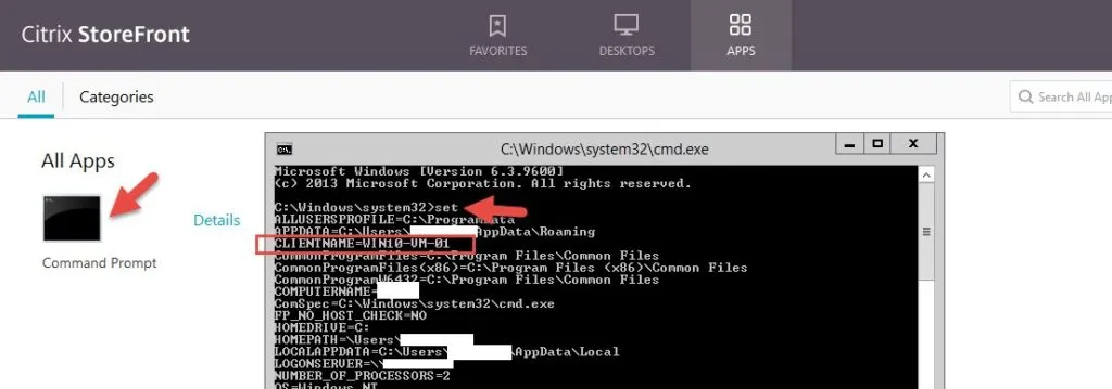 Let’s look at how a session looks with a default StoreFront deployment. I have published a command prompt to myself. I login to StoreFront using my web browser or from a Windows Receiver. After launching it I type in “set” and can see all the environmental variables. You can see the CLIENTNAME variable is set to the client name I launched the ICA session from, in this case my virtual desktop: