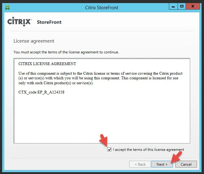 11. Now let’s upgrade this 2 node StoreFront 3.8 server group to StoreFront 3.9. As always, snapshot both your VMs and disable traffic to StoreFront at the NetScaler. This will help minimize the chance of your StoreFront upgrade failing as a busy system often means the installer can’t continue and you end up with a failed upgrade. Make a copy of the web.config and StoreCustomization_Input.dll file. Then you can run the CitrixStoreFront-x64.exe installer for 3.9. Accept the license agreement and hit Next: