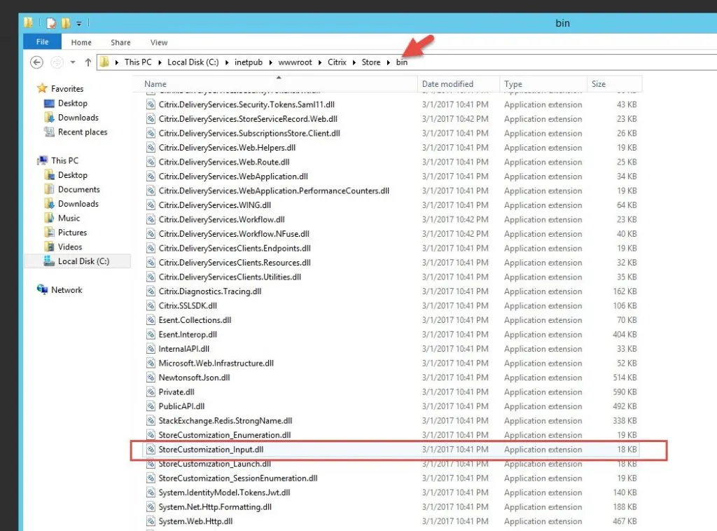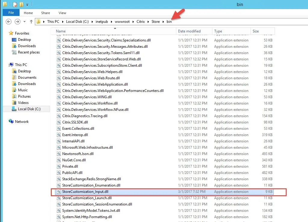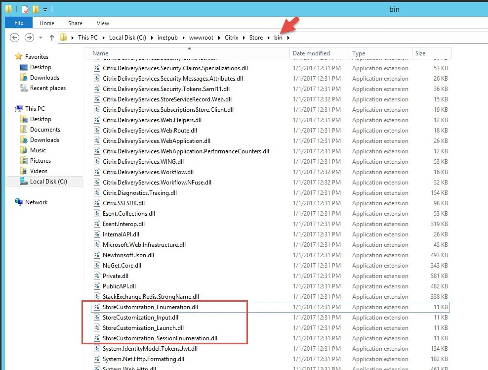 3. Navigate to your StoreFront Store’s bin folder. In this example my Store is named the default “Store”. Note, this is not the StoreWeb folder so don’t get confused here. There will be 4 place holder DLL files called StoreCustomization_Enumeration.dll, StoreCustomization_Input.dll, StoreCustomization_Launch.dll, and StoreCustomization_SessionEnumeration.dll. Copy these 4 DLL/assembly files somewhere safe as a backup. We’re only going to be overwriting one in the next step but always a good idea to have a backup of all these incase later you want to do other customizations: