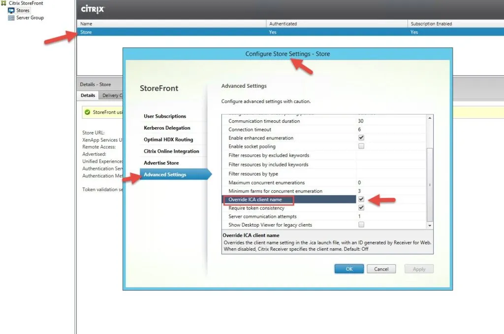 IMPORTANT NOTE: The SDK customization to rewrite the CLIENTNAME variable to whatever you want requires you to flip on the “Override ICA client name” advanced setting in StoreFront in order for it to work. This option is used to override the client name in the .ica launch file with an ID generated by Receiver for Web. We’ll be doing this in the web.config later manually but if you wanted to do it yourself via GUI it’s under Advanced Settings: