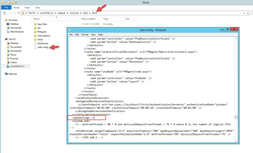 5. Now go up one directory and open up the web.config. Make sure you open Notepad as “Run as Administrator” and then go open the web.config. Otherwise you won’t be able to save your changes. Do a Find (Ctrl+F) for the word “appSettings” and you’ll see this section:
