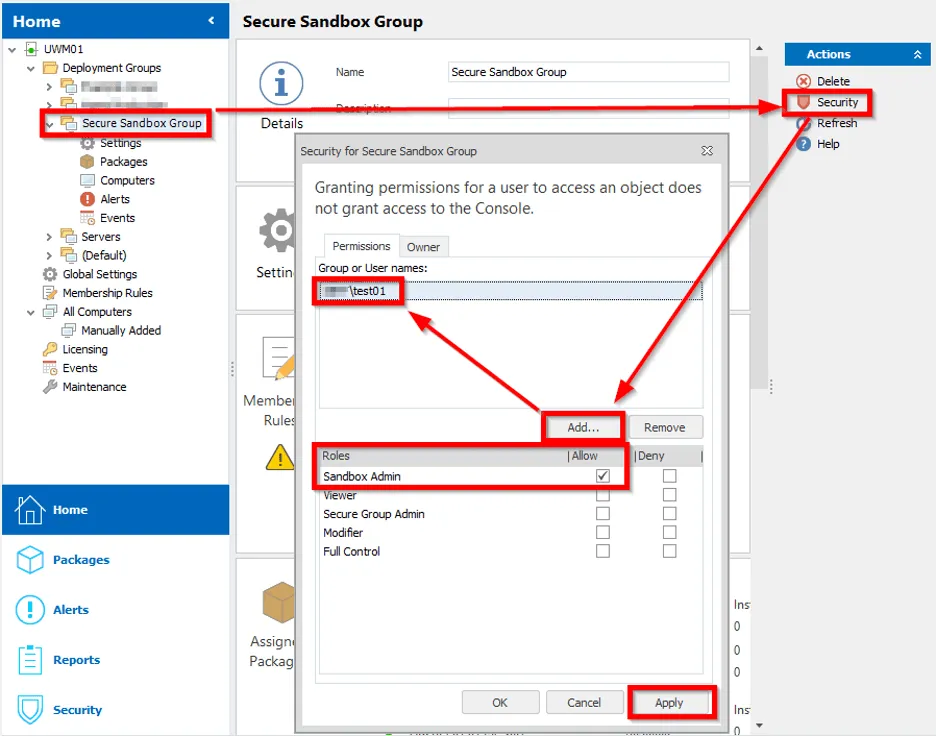 In this example, we’re creating a new Deployment Group specifically for this effort called “Secure Sandbox Group”. Once that’s created, select the deployment group and go to the Security option on the right. Add the User or Group that is to be granted permission, and assign it he “Sandbox Admin” role:
