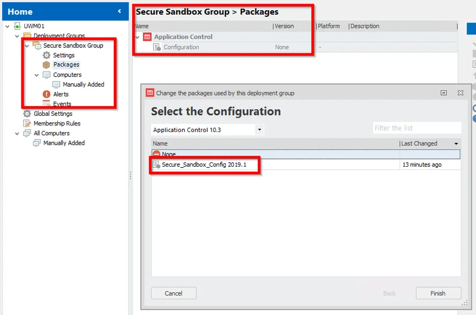 You’ll notice in this example, we’re only deploying Application Control, and we are not assigning a policy. That can be done later by our sandbox’d administrator. The targeted machines for the Sandbox group will also need to be moved ahead of time by a global administrator, as we’ve chosen not to grand our sandbox admin rights to perform this function.